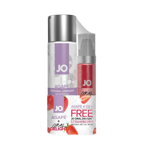 Agape 4 oz+ JO Oral Delight 10z. Disfruta de este set de lubricante y estimulante con sensación fresca comestible, El lubricante personal refleja la lubricación natural, no contiene glicerina, aromas ni sabor, diseñado para personas con sensibilidad en la piel, (hidrata suavemente y mejorar los momentos íntimos).