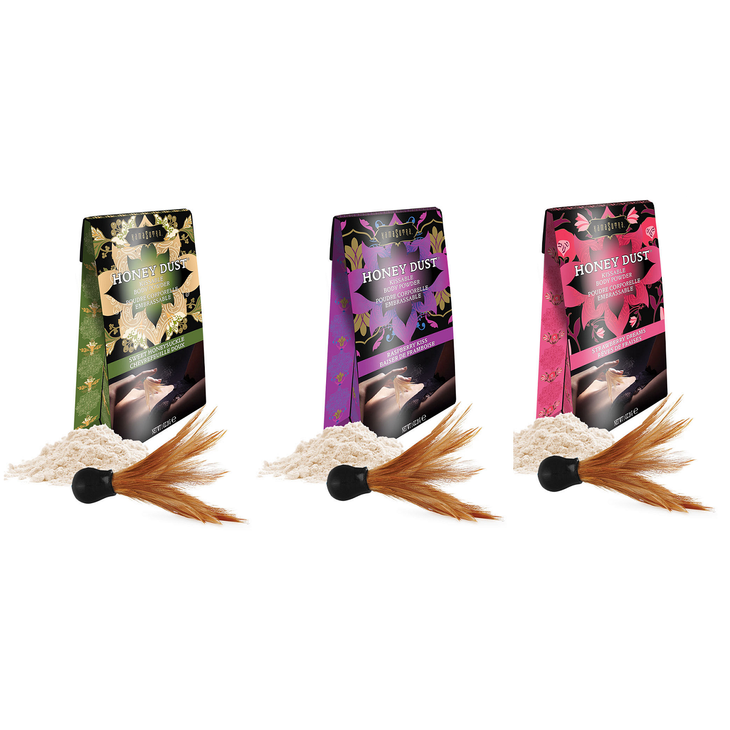 Honey Dust Honeysuckle 1oz: Disfruta del seductor sabor de este polvo de miel en tu cuerpo o en el cuerpo de tu pareja. Este dejará tu piel con un brillo inigualable, una suave fragancia y un irresistible sabor. Es ideal para esos momentos de besos y caricias en el momento previo al acto. Coloca el plumero en el talco, acaricia todo el cuerpo de tu pareja y disfruta besando su cuerpo. Disfruta sus diferentes sabores.