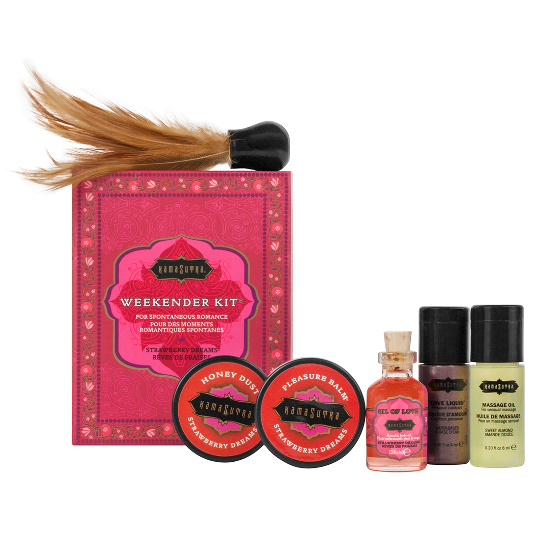 The Weekender Kit Strawberry: Prueba un poco de todos los placeres de Kama Sutra con este set para llevarlo en tu bolsa o bolsillo. Incluye pequeñas porciones del aceite del amor fresa, bálsamo Placer sabor fresa, lubricante líquido, aceite para masaje de almendras dulces y talco de fresa con aplicador de plumas. Un verdadero clásico para los experimentados en Kama Sutra, o para quienes que no han explorado el placer. Perfecto para una velada romántica o un fin de semana.