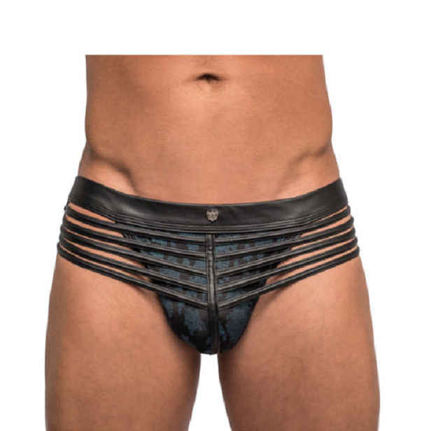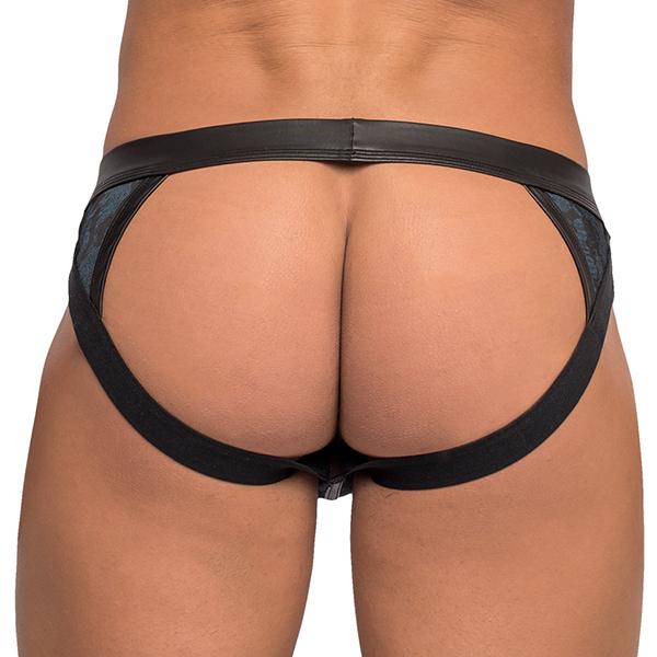 Male Power Strappy Jock: Mejora los contornos de tu cuerpo con esta sexy tanga, con correas delanteras de aspecto de cuerpo, banda para las piernas y pretina con logo.